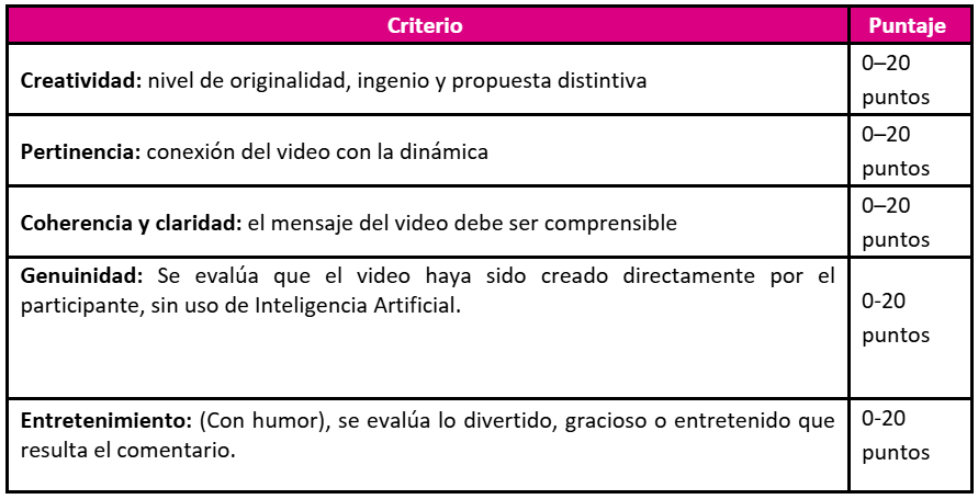 Los videos que cumplan con los requisitos mínimos serán evaluados con base en los siguientes criterios, cada uno con un puntaje entre 0 y 20 puntos, para un total máximo de 60 puntos.